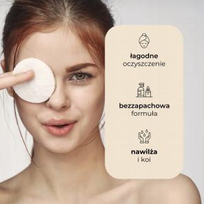 - Nanieś płyn micelarny na płatek kosmetyczny i delikatnie przetrzyj skórę twarzy, szyi i dekoltu.