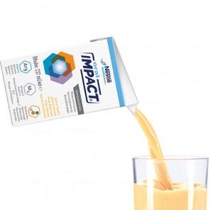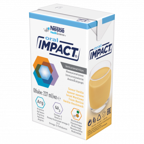 Impact Oral to kompletny, wysokobiałkowy i wysokoenergetyczny środek odżywczy w płynie, zawierający kwasy tłuszczowe omega-3, argininę oraz nukleotydy, przeznaczony do postępowania dietetycznego w przypadku niedożywienia u pacjentów chirurgicznych. Produkt dostępny w formie gotowej do picia, najlepiej podawać schłodzony. Produkt powinien być stosowany pod kontrolą lekarza. Bezglutenowy i bezlaktozowy.