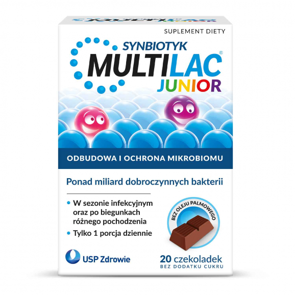 - Nazwa produktu: Multilac Junior Synbiotyk, czekoladki bez cukru, 20 szt.