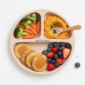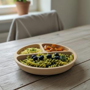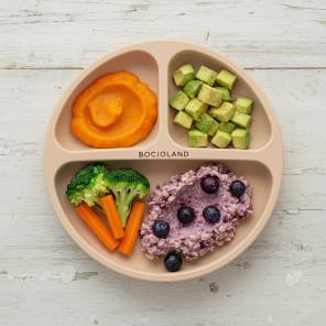 Beżowy talerzyk silikonowy Bocioland jest doskonałym wsparciem przy pierwszych posiłkach dziecka. Wykonany z bezpiecznego silikonu spożywczego, wolnego od BPA, PVC i ftalanów. Dzięki trzem komorom pozwala na serwowanie różnorodnych potraw bez ich mieszania oraz ułatwia odkrywanie smaków. Wyposażony w cztery mocne przyssawki, zapewnia stabilność i bezpieczeństwo, chroniąc przed rozlaniem jedzenia. Materiał jest elastyczny, co sprawia, że łatwo się czyści i jest odporny na różne temperatury. Może być używany w mikrofalówce, piekarniku i zmywarce, a także przechowywany w zamrażarce. Produkt posiada certyfikaty bezpieczeństwa CE i OEKO-TEX.