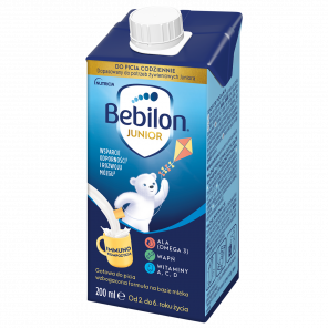 Bebilon Junior do picia to gotowa do spożycia formuła na bazie mleka, wzbogacona w witaminy i minerały, przeznaczona dla dzieci w wieku od 2 do 6 lat.