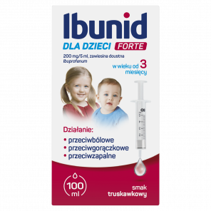 Ibunid dla dzieci Forte to zawiesina doustna o smaku truskawkowym zawierająca ibuprofen, należący do grupy niesteroidowych leków przeciwzapalnych (NLPZ). Stosowany w leczeniu gorączki oraz dolegliwości bólowych u dzieci i niemowląt. Każde 5 ml zawiera 200 mg ibuprofenu. Przeznaczony do stosowania u dzieci od 3 miesięcy. Butelka zawiera 100 ml produktu.