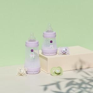 MAM Baby Perfect Start to antykolkowa butelka zaprojektowana z myślą o najmłodszych. Produkt wyróżnia się funkcją redukcji powstawania pęcherzyków powietrza i kolki poprzez specjalnie wentylowaną podstawę, która umożliwia spokojne picie przez niemowlaka. Smoczek z MAM SkinSoft™ silikonem jest łatwo akceptowany przez 94% dzieci ze względu na przyjemny, znany dotyk przypominający matczyną pierś. Dzięki unikalnej funkcji samosterylizacji, butelka jest wygodna w użyciu poza domem – wystarczą trzy kroki aby zapewnić pełną higienę. Przeznaczona dla dzieci od 2 miesiąca życia, bezpieczna dla matczynych pokarmów i mieszanek sztucznych.
