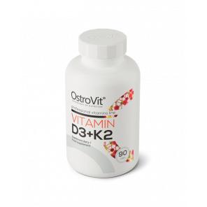 Suplement diety OstroVit D3 1000 IU + K2 MK-7 daje wsparcie dla kości, zębów oraz układu odpornościowego. Zawiera naturalnie przyswajalne witaminy D3 i K2 MK-7 z tradycyjnego japońskiego natto. Witamina D3 wspiera wchłanianie wapnia i fosforu oraz funkcjonowanie układu mięśniowego. Witamina K2 odpowiada za krążenie wapnia, co wspomaga zdrowie kości.
