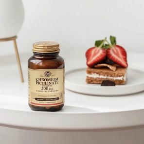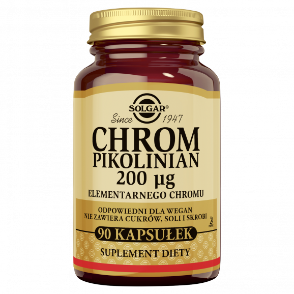 Solgar Chrom Pikolinian 200 mcg – suplement diety w formie kapsułek, zawierający 200 mikrogramów elementarnego chromu na porcję. Chrom w formie pikolinianowej charakteryzuje się zwiększoną biodostępnością w porównaniu do innych form. Produkt jest bezglutenowy i nie zawiera cukrów, soli, ani żadnych sztucznych dodatków. Przeznaczony dla osób dorosłych dbających o poziom glukozy we krwi.