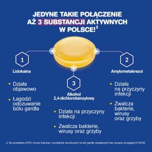 1 pastylka zawiera: 2 mg lidokainy chlorowodorek jednowodny, 0,6 mg amylometakrezolu, 1,2 mg alkoholu 2,4-dichlorobenzylowego.
