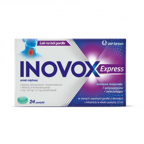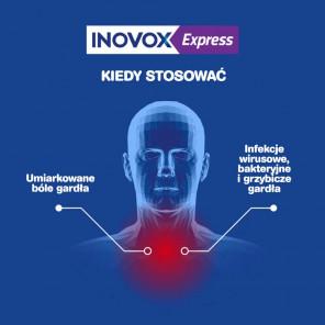 Inovox Express to pastylki zapewniające szybką ulgę w bólu gardła już w 1 minutę, dzięki zawartości lidokainy, amylometakrezolu oraz alkoholu 2,4-dichlorobenzylowego. Produkt przeznaczony jest do stosowania przy pierwszych objawach bólu gardła, pomaga zwalczać wirusy, bakterie oraz grzyby - przyczyny infekcji w jamie ustnej i gardle.