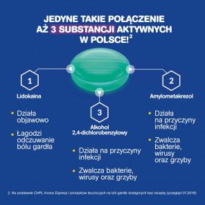 Każda pastylka zawiera: Lidokainy chlorowodorek: 2,00 mg, Amylometakrezol: 0,60 mg, Alkohol 2,4-dichlorobenzylowy: 1,20 mg, Sacharoza: 1495,33 mg, Glukoza ciekła: 1016,82 mg.