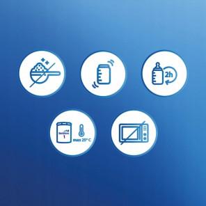- Produkt jest gotowy do użycia w temperaturze pokojowej lub po uprzednim podgrzaniu metodą kąpieli wodnej w butelce dla dziecka.