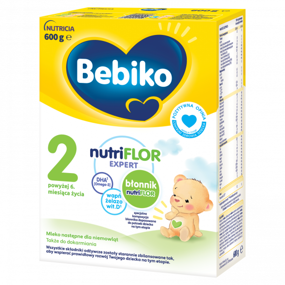Bebiko 2 NUTRIflor Expert to mleko następne przeznaczone dla niemowląt powyżej 6. miesiąca życia, w czasie kiedy dieta dziecka jest stopniowo rozszerzana. Produkt może być stosowany po karmieniu piersią lub po mleku początkowym, a także do dokarmiania (po konsultacji ze specjalistą). Formuła zawiera m.in. DHA (dla wsparcia rozwoju wzroku i mózgu), ALA (omega‑3) (dla prawidłowego rozwoju mózgu i tkanki nerwowej) oraz żelazo i jod wspierające rozwój poznawczy. W składzie znajduje się również kompozycja oligosacharydów/błonnika GOS/FOS dopasowana do potrzeb malucha na tym etapie. Produkt jest bez oleju palmowego, a także – zgodnie z deklaracjami producenta – bez konserwantów, barwników i wzmacniaczy smaku.
