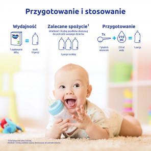 - Przykładowo (orientacyjnie): od 7. miesiąca i powyżej: 3 porcje na dobę; na 1 porcję: 210 ml wody + 7 płaskich miarek proszku.