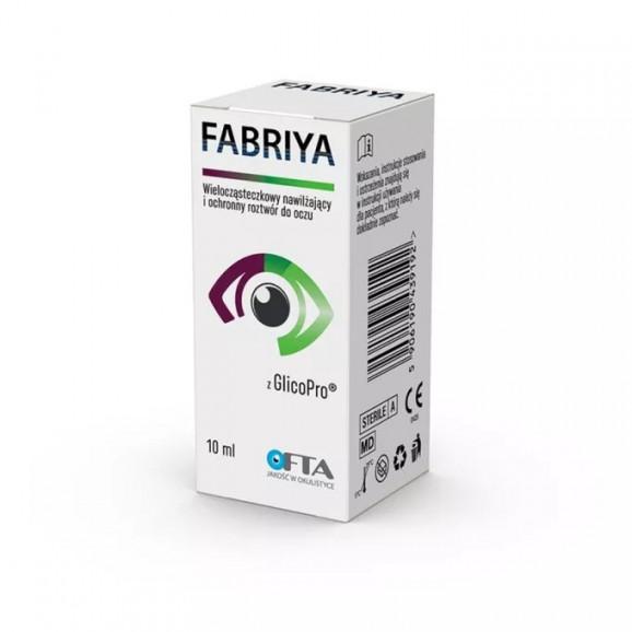 Fabriya to wyrób medyczny w postaci roztworu do oczu, przeznaczony dla osób dorosłych. Preparat działa smarująco, ochronnie, nawilżająco, łagodząco oraz antyoksydacyjnie, wspierając zachowanie równowagi środowiska na powierzchni oka. Jest szczególnie przydatny w przypadku zespołu suchego oka, a także w leczeniu wspomagającym podrażnień i stanów zapalnych spowodowanych m.in. warunkami środowiskowymi (wiatr, klimatyzacja, dym, praca przed ekranem) lub urazami mechanicznymi.