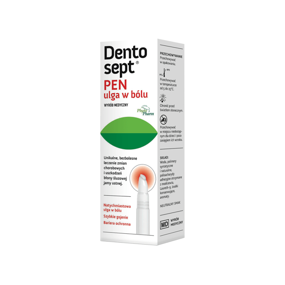 Dentosept PEN łagodzi ból w jamie ustnej spowodowany zmianami chorobowymi błony śluzowej jamy ustnej na przykład aftami. Regeneruje uszkodzoną błonę śluzową jamy ustnej.