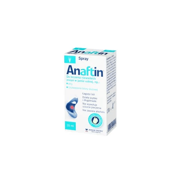 Anaftin Spray łagodzi dolegliwości bólowe wywołane przez niewielkie zmiany w jamie ustnej, takie jak aftowe zapalenie jamy ustnej, owrzodzenia aftowe, jak również zmiany wywołane przez aparaty ortodontyczne i źle dopasowane protezy.