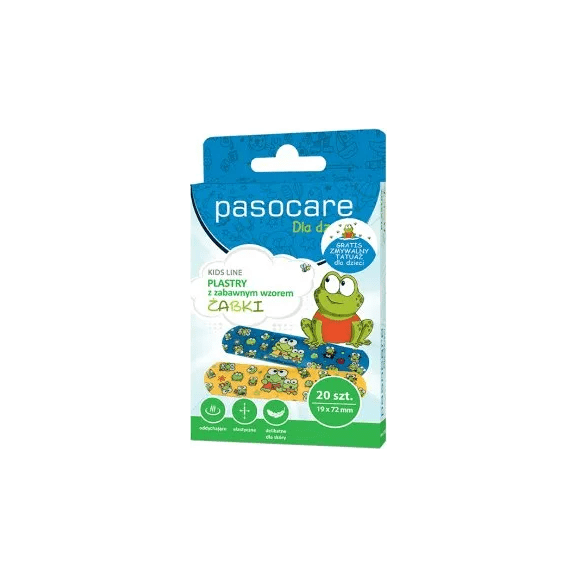 • Plasterki z opatrunkiem Pasocare są drukowane w kolorowy motyw z żabkami, dzięki czemu są atrakcyjnym wyrobem dla dzieci. Nadają się dla osób o wrażliwej skórze.