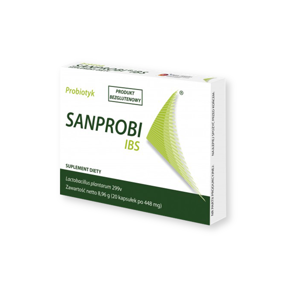 Sanprobi IBS - suplement diety stanowiący uzupełnienie diety w bakterie kwasu mlekowego Lactobacillus plantarum 299v, które wspomagają florę jelitową organizmu. Probiotyk przeznaczony dla dzieci od 3. roku życia, młodzieży i dorosłych, a także dla kobiet w okresie ciąży i karmiących piersią. Produkt jest bezpieczny również dla osób z zaburzeniami układu odpornościowego.
