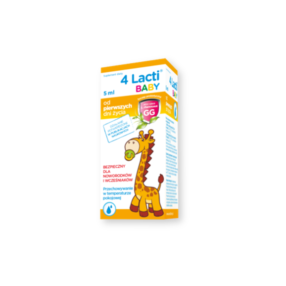 4Lacti Baby to suplement diety zawierający probiotyczny szczep Lactobacillus rhamnsosus GG. Preparat przeznaczony dla noworodków, niemowląt, dzieci oraz osób dorosłych.