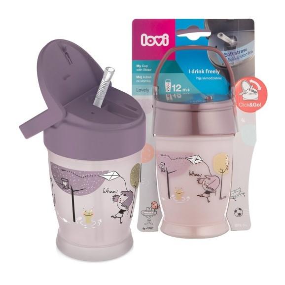 Kubek ze słomką LOVI został specjalnie zaprojektowany tak, by pozwolić dziecku samodzielnie ugasić pragnienie. Po zamknięciu z kubeczka nic się nie wylewa ponieważ został zabezpieczony systemem Click&Go i Safe Lock. Charakterystyczne kliknięcie to gwarancja, że kubek jest dobrze zamknięty. Poręczny uchwyt umożliwia wygodne noszenie i aktywny maluch może go wszędzie ze sobą zabrać. Słomka wchodząca w skład została wykonana z miękkiego silikonu o wysokiej jakości, który nie podrażnia dziąseł i jest obojętny chemicznie. Nakrętka wymienna z innymi kubkami LOVI może być stosowana wymiennie z nakrętką kubka 360 lub kubka-niekapka LOVI.