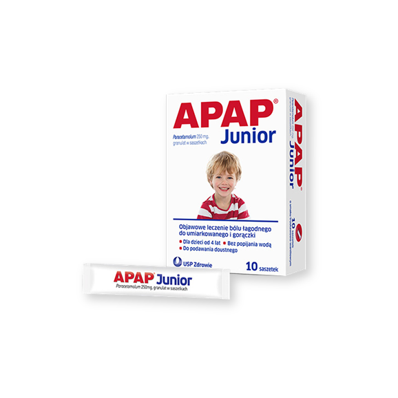 Apap Junior to lek w formie truskawkowo-waniliowego granulatu podawanego na język, który jest przeznaczony dla dzieci. Lek zawiera paracetamol, który działa przeciwbólowo oraz przeciwgorączkowo. Apap Junior stosuje się w objawowym leczeniu łagodnego i umiarkowanego bólu oraz gorączki u dzieci w wieku powyżej 4 lat.