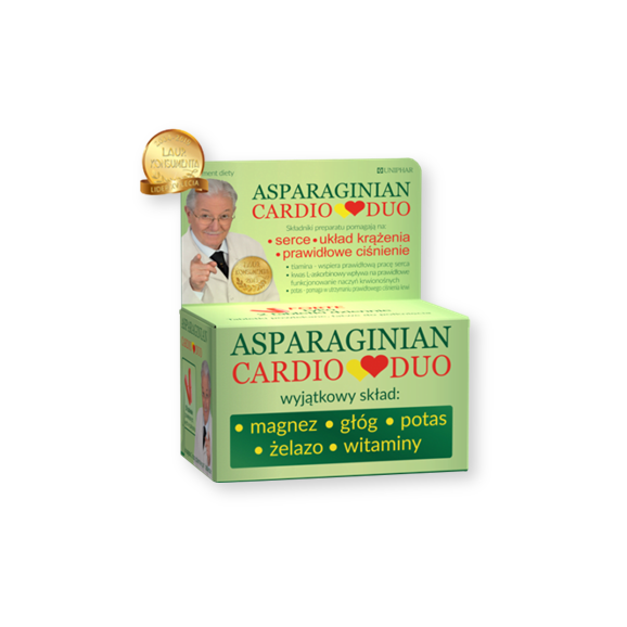 Asparaginian Cardio Duo - suplement diety zawierający składniki pomagające na serce, układ krążenia, prawidłowe ciśnienie. Produkt przeznaczony dla osób dorosłych.
