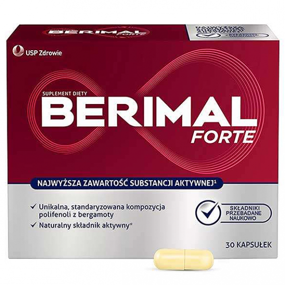 Berimal Forte - suplement diety zawierający wysoką zawartość polifenoli z bergamoty Citrus bergamia Risso w formie ActiBPF. Produkt przeznaczony dla osób dorosłych.