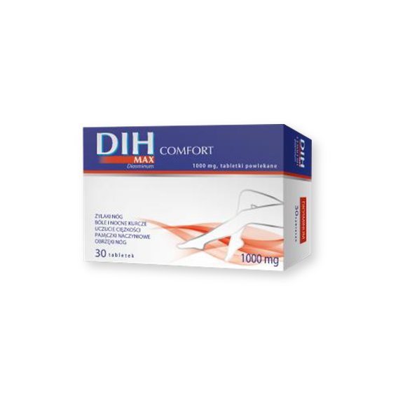 Lek DIH MAX COMFORT zawiera diosminę, która wykazuje działanie ochrone wobec naczyń żylnych. Zmniejsza ich przepuszczalność, zapewnia elastyczność i zwiększa napięcie ich ścian. Poprzez poprawę powrotu krwi z układu żylnego kończyn dolnych, zmniejsza nadciśnienie i zastój żylny w tych kończynach.