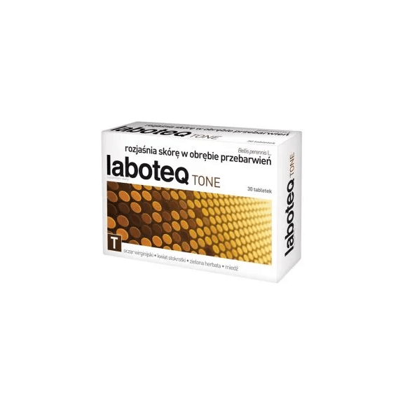 Laboteq Tone to suplement diety stworzony z myślą o osobach, które zmagają się z hiperpigmentacją, która występuje na skutek miejscowej nadprodukcji melaniny w skórze, doprowadzając do pojawienia się nieregularnych plam, piegów czy przebarwień. Skład Laboteq Tone łączy trzy składniki roślinne - wyciąg z kwiatu stokrotki, ekstrakt z zielonej herbaty i wyciąg z oczaru wirginijskiego oraz witaminy i minerały. Zawarta w suplemencie diety miedź pomaga w utrzymaniu prawidłowej pigmentacji skóry, a wyciąg z kwiatu stokrotki (z łac. Bellis perennis L.) wspomaga jej rozjaśnienie. Preparat zawiera formułę CRH (Continuous Hyperpigmentation Reduction). Przeznaczony jest do uzupełnienia codziennej zbilansowanej diety dorosłych w składniki aktywne zawarte w produkcie. Dzienna zalecana dawka suplementu Laboteq Tone to 1 tabletka.