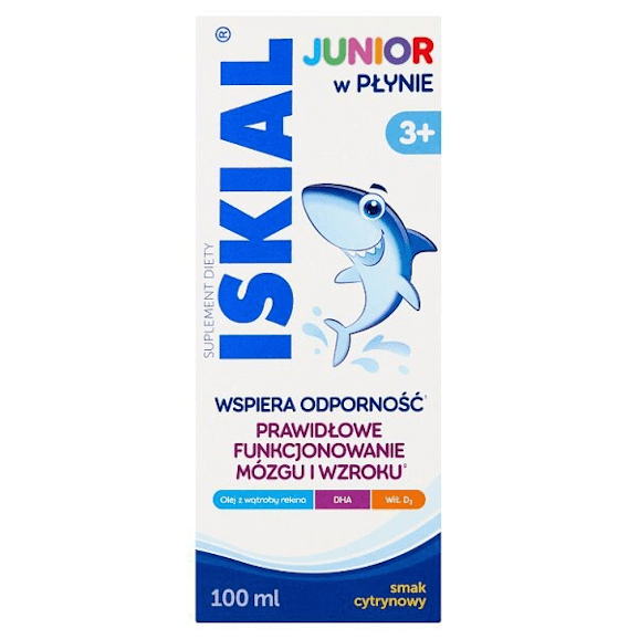 Iskial Junior w Płynie to suplement diety o kompleksowej formule, która łączy w sobie olej z wątroby rekina, olej z wątroby dorsza będący naturalnym źródłem kwasu dokozaheksaenowego (DHA) z wysoką zawartością witaminy D ważną dla prawidłowego funkcjonowania układu odpornościowego oraz prawidłowego wzrostu i rozwoju kości u dzieci, jak również zdrowia kości dorosłych. DHA jest jednym z wielonienasyconych kwasów tłuszczowych zaliczanych do rodziny omega-3. Składnik ten spożywany w ilości 250 mg dzienne przyczynia się do utrzymania prawidłowego funkcjonowania mózgu oraz wspiera utrzymanie prawidłowego widzenia. Jego cennym źródłem są przede wszystkim tłuste ryby takie jak makrela, tuńczyk czy właśnie dorsz.