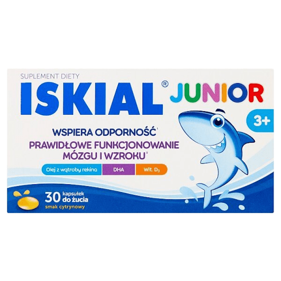 Iskial Junior to suplement diety w postaci kapsułek do żucia o cytrynowym smaku. Kompleksowa formuła łączy w sobie olej z wątroby rekina z wysoką zawartością witaminy D oraz olejem rybim będącym cennym źródłem kwasu dokozaheksaenowego (DHA). Składnik ten spożywany w ilości 250 mg dziennie wspiera utrzymanie prawidłowego funkcjonowania mózgu oraz pomaga zachować prawidłowe widzenie. Jednocześnie zawarta w produkcie witamina D przyczynia się do utrzymania prawidłowego funkcjonowania układu odpornościowego. Wspiera również prawidłowy wzrost i rozwój kości u dzieci.