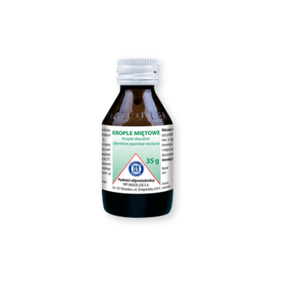 nalewka miętowa (Menthae piperitae tinctura) o zawartości olejku miętowego nie mniej niż 5%, DER 1:19,7-21, ekstahent: etanol 90% (v/v) 1 g.