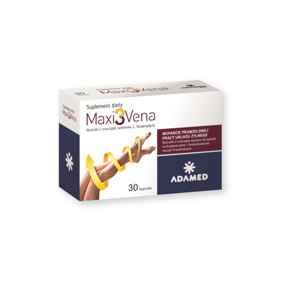 Maxi3Vena - zawarty w produkcie ekstrakt z ruszczyka wpływa korzystnie na krążenie żylne i funkcjonowanie naczyń krwionośnych. Kwas askorbinowy wspomaga prawidłową produkcję kolagenu, a przez to zapewnia prawidłowe funkcjonowanie naczyń krwionośnych. Opakowanie zawiera 30 sztuk.