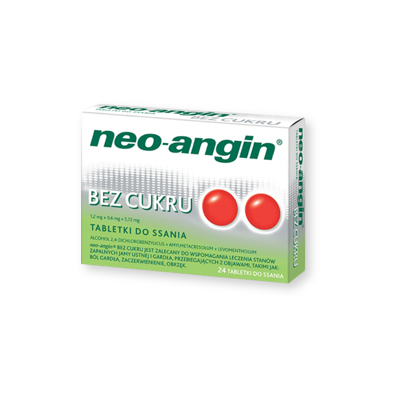 Tabletki do ssania Neo-angin bez cukru to lek o działaniu przeciwbakteryjnym i przeciwgrzybiczym. Lek zawiera w składzie także lekko znieczulający miejscowo i dający uczucie chłodzenia błon śluzowych lewomentol. Neo-angin bez cukru stosuje się pomocniczo w leczeniu objawów stanów zapalnych gardła i jamy ustnej, jak ból, obrzęk czy zaczerwienienie gardła.