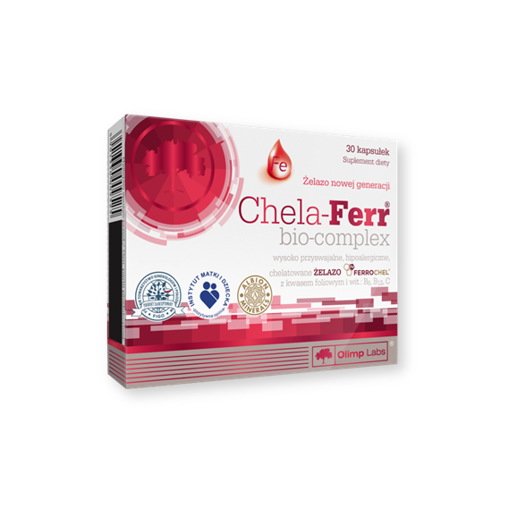 Olimp Chela-Ferr Bio-Complex - suplement diety, zawierający żelazo, kwas foliowy, witaminy B12 i B6, czyli składniki, które wspierają procesy krwiotwórcze. Produkt przeznaczony dla dzieci powyżej 3 lat, osób dorosłych, kobiet w ciąży i karmiących piersią, okresie menopauzalnym, dawcom krwi.