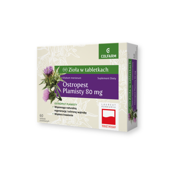 Ostropest Plamisty - suplement diety wspomagający produkcję żółci oraz naturalną regenerację komórek i tkanek wątroby. Produkt przeznaczony dla osób dorosłych.