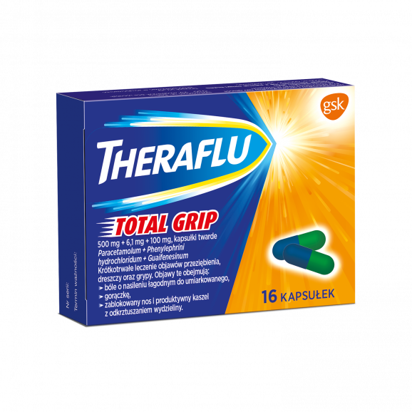 Theraflu Total Grip, 500 mg + 6,1 mg + 100 mg, kapsułki twarde, 16 szt.