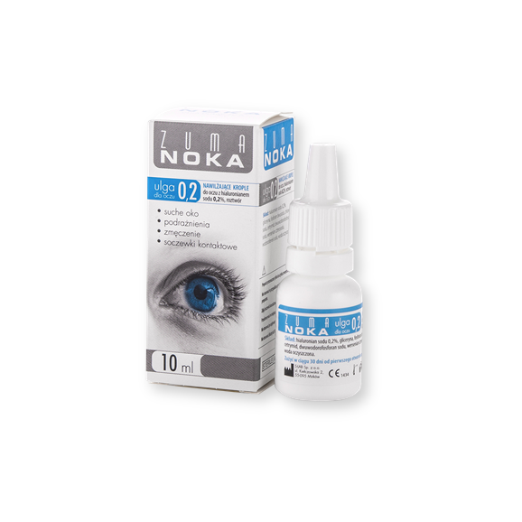 Wyrób medyczny Zuma Noka 0,2 ulga dla oczu: są nawilżającymi kroplami do oczu zawierającymi 0,2% roztwór hialuronianu sodu, otrzymywany na drodze syntezy biotechnologicznej. Hialuronian sodu ze względu na swoje szczególne właściowości fizykalne, lepkosprężyste i zdolność przylegania do rogówki, poprawia stabilność filmu łzowego i komfort widzenia.