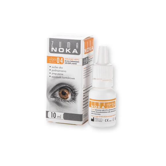 Wyrób medyczny Zuma Noka 0,4 ulga dla oczu: są nawilżającymi kroplami do oczu zawierającymi 0,4% roztwór hialuronianu sodu, otrzymywany na drodze syntezy biotechnologicznej. Hialuronian sodu ze względu na swoje szczególne właściowości fizykalne, lepkosprężyste i zdolność przylegania do rogówki, poprawia stabilność filmu łzowego i komfort widzenia.