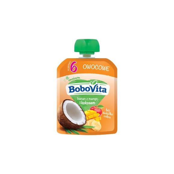 - Delikatny mus z bananów i mango z dodatkiem mleka kokosowego BoboVita w tubce to smaczna i zdrowa przekąska dla dzieci już po 6. miesiącu życia. Wyprodukowany z owoców poddanych starannej kontroli, spełnia wszelkie wymagania stawiane produktom żywnościowym dla dzieci. Zgodnie z wymogami prawa, produkty dla dzieci BoboVita nie zawierają konserwantów, barwników, wzmacniaczy smaku ani składników modyfikowanych genetycznie.