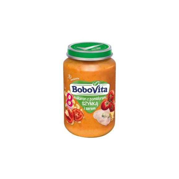 - Delikatna potrawka BoboVita makaron z pomidorami, szynką i serem jest przygotowana ze składników najwyższej jakości. Delikatna konsystencja jest odpowiednia dla małych dzieci, a starannie dobrany skład spełnia wszelkie normy przewidziane przez przepisy określające bezpieczeństwo żywności dla niemowląt. Produkt, zgodnie z przepisami prawa, nie zawiera konserwantów, barwników i wzmacniaczy smaku. Nie zawiera także dodanego cukru ani soli.