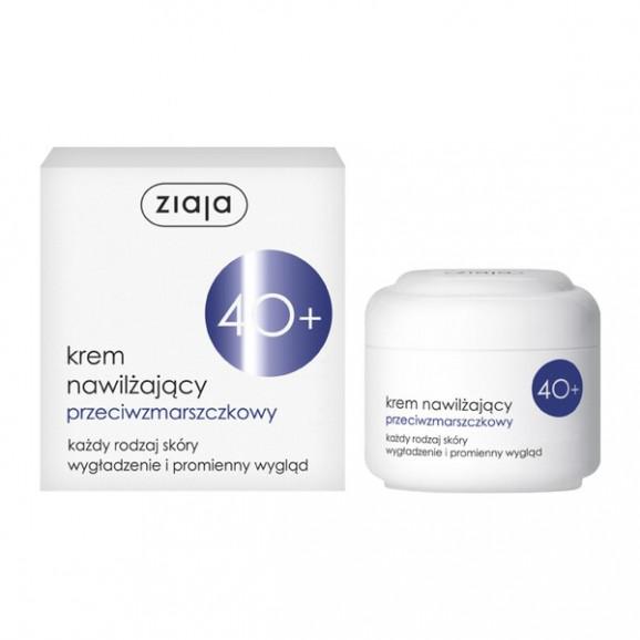 Ziaja 40+, krem nawilżający, przeciwzmarszczkowy - regulując gospodarkę wodną skóry, zapobiega nadmiernemu wysuszaniu. Utrzymuje prawidłowy poziom lipidów epidermy. Odbudowuje wewnętrzną strukturę skóry. Wyraźnie poprawia jędrność i elastyczność naskórka. Aktywując włókna podporowe wyraźnie wygładza zmarszczki. Wzmacnia elastynę i skutecznie redukuje objawy starzenia skóry. Przeciwdziała wiotczeniu skóry, poprawia jej gęstość i sprężystość. Zawiera rozjaśniającą witaminę C oraz substancje liporegenerujące. Pojemność 50 ml.