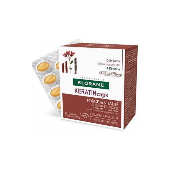 KLORANE KERATINcaps to suplement, który zawiera wyciąg z chinowca Cinchona pubescens Vahl. Bez barwników.