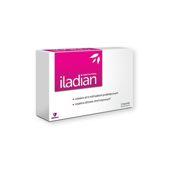 Iladian - suplement diety zawierający bakterie probiotyczne: pałeczki kwasu mlekowego L. rhamnosus, L. reuteri. Produkt zawiera również wyciąg z migdałecznika chebułowca, który wspiera zdrowie układu moczowego i stref intymnych. Preparat przeznaczony dla osób dorosłych.
