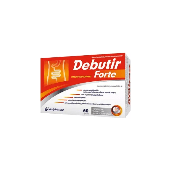 Debutir Forte to żywność specjalnego przeznaczenia medycznego w postaci kapsułek, która zawiera sól sodową oraz kwas masłowy. Wspomaga proces odżywiania pacjentów z chorobami układu pokarmowego. Kwas masłowy jest podstawowym materiałem energetycznym dla nabłonka jelit. Zastosowanie w produkcie Debutir Forte nowoczesnej technologii granulacji soli sodowej kwasu masłowego w przeciwieństwie do standardowych postaci maślanu sodu zabezpiecza go przed całkowitym wykorzystaniem w górnym odcinku przewodu pokarmowego. Skład jest tak dobrany, aby proces uwalniania maślanu sodu odbywał się stopniowo na całej długości przewodu, szczególnie z uwzględnianiem jego dalszych odcinków.