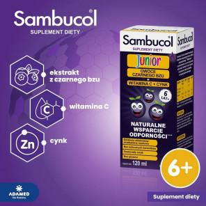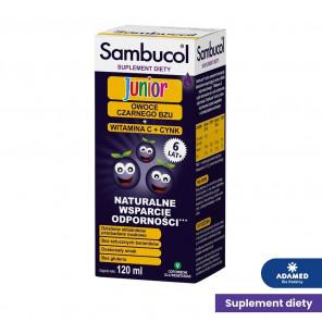 Sambucol Junior to suplement diety w płynie przeznaczony dla dzieci powyżej 6. roku życia oraz osób dorosłych. Zawiera sok z owoców czarnego bzu, a dodatkowo witaminę C i cynk – składniki, które wspierają prawidłowe funkcjonowanie układu odpornościowego. Witamina C i cynk pomagają także w ochronie komórek przed stresem oksydacyjnym. Produkt polecany jest szczególnie w okresach zwiększonego zapotrzebowania na wsparcie odporności, np. w sezonie jesienno-zimowym.
