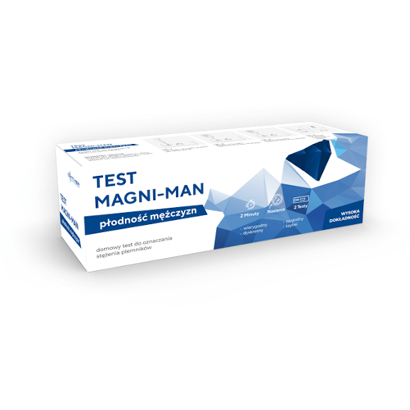 TEST MAGNI-MAN przeznaczony jest do oznaczania stężenia plemników, jest środkiem pomocniczym w diagnostyce i obserwacji leczenia niepłodności u mężczyzn. Za pomocą testu określimy zawartość plemników w nasieniu w odniesieniu do wartości granicznych. Wynik testu wskazujący stężenie plemników niższe niż poziom testowy 15mln/ml, może wskazywać na oligozoospermię oraz czynnik męskiej niepłodności.