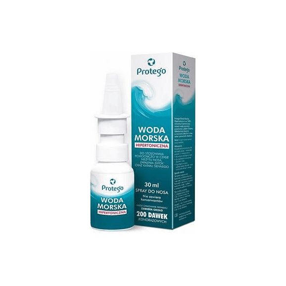 Protego, woda morska w sprayu to w 100% naturalny hipertoniczny roztwór wody morskiej bogatej w naturalne składniki mineralne i pierwiastki. Przeznaczona do codziennego oczyszczania jam nosowych niemowląt powyżej 1 miesiąca życia, dzieci oraz osób dorosłych. Działa łagodząco w czasie podrażnienia, śluzówki nosa podczas infekcji i alergii. Dodatkowo przyczynia do nawilżania wysuszonej śluzówki nosa.