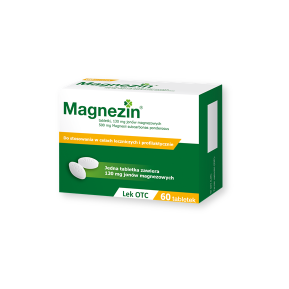 Magnezin, 130 mg jonów magnezowych, tabletki - produkt leczniczy do stosowania leczniczego i profilaktycznego w celu zapobiegania niedoborów magnezu, w stanach jego obniżonego stężenia (hipomagnezemii). Magnezin może być stosowany m.in. we zmożonym wysiłku fizycznym, podczas stosowania niektórych leków (np. moczopędnych), wspomagająco w dolegliwościach serca. Opakowanie zawiera 60 sztuk.