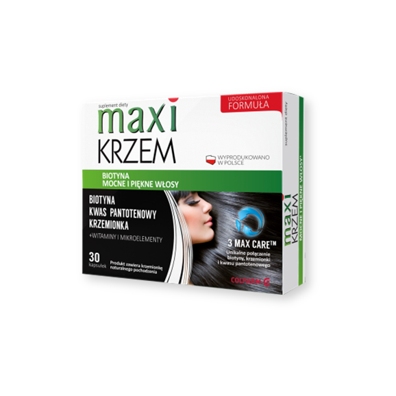 Maxi Krzem - suplement diety zawierający unikalne połączenie biotyny, krzemionki i kwasu pantotenowego z wyciągiem ze skrzypu polnego i ziela pokrzywy. Produkt przeznaczony dla osób dorosłych.