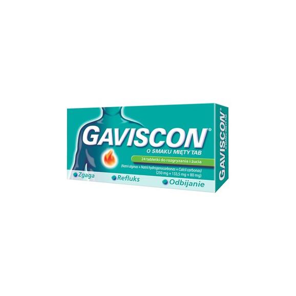 Gaviscon o smaku mięty TAB to produkt leczniczy przeznaczony do leczenia objawów refluksu żołądkowo-przełykowego, takich jak: odbijanie, zgaga i niestrawność (związana z refluksem), na przykład po posiłkach lub w czasie ciąży albo u pacjentów z objawami związanymi z refluksowym zapaleniem przełyku.