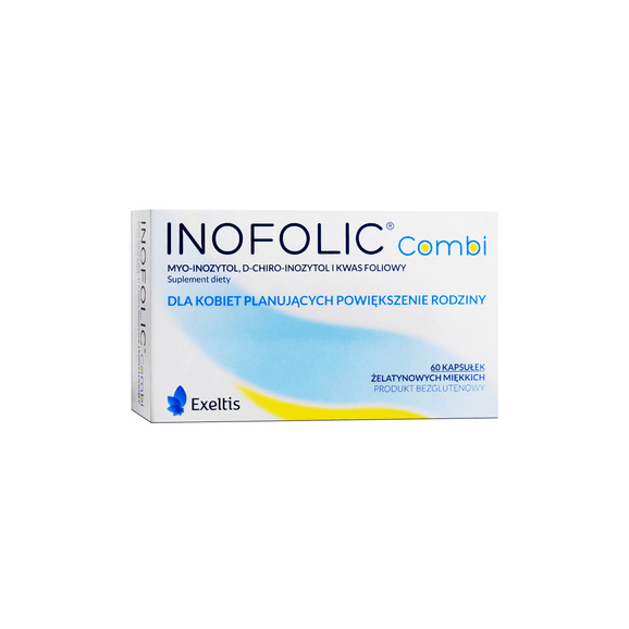 INOFOLIC Combi to suplement diety zawierający dwie formy izomeryczne inozytolu: myo-inozytol, d-chiro-inozytol oraz kwas foliowy. Składniki te zaleca się stosować celem zapewnienia niezbędnych ich ilości w organizmie kobiety w okresie, w którym planuje ona powiększenie rodziny, gdy ich spożycie wraz z pokarmami jest niewystarczające. Inozytol to substancja z grupy witamin B. Najczęściej spotykaną w przyrodzie formą jego występowania jest myo-inozytol. Kwas foliowy bierze udział w procesie podziału komórek oraz pomaga w prawidłowej produkcji krwi.